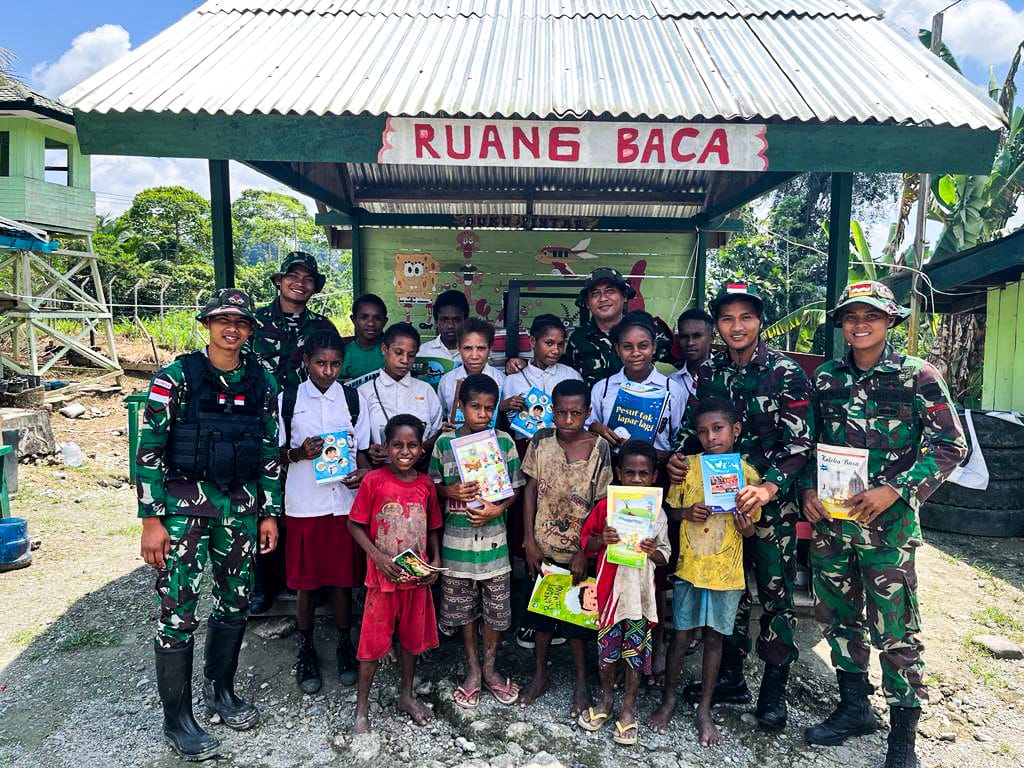 Menumbuhkan Minat Membaca Sejak Dini, Satgas Pamtas Ri-PNG Sektor Utara Yonif 122/Tombak Sakti Pos Kalimo membuat Perpustakaan Mini di Pos Perbatasan,Distrik Waris kabupaten Keerom kampung Kalimo, Selasa,(05/09/2023).