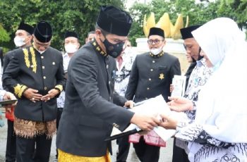 Bireuen – jurnalpolisi.id Komandan Kodim 0111/Bireuen Letkol Inf M. Ali Akbar,S.I.P pada Senin (29/11/2021) menghadiri upacara bendera peringatan Hari Guru Nasional tahun 2021 yang dilaksanakan di halaman pendopo Bupati Bireuen Desa Bandar Bireuen Kec. Kota Juang Kab.Bireuen. Upacara bendera dalam rangka memperingati Hari Guru Nasional dilaksanakan setiap tahunnya. Peranan seorang guru memiliki tugas yang sangat mulia, membentuk masa depan generasi penerus bangsa dan dihadapkan dengan kemajuan teknologi dan informasi yang terus berkembang.Hal tersebut sangatlah berpengaruh terhadap perilaku serta kehidupan kita sehari-hari. Sehingga memerlukan kesadaran kita bersama khususnya guru untuk selalu berperan aktif dalam mengawasi anak didiknya disekolah, pungkas Dandim. Upacara bendera dalam rangka hari Guru Nasional tersebut mengusung tema “Bergerak dengan hati kita pulihkan pendidikan” yang dipimpin langsung oleh Bupati Bireuen Dr.H.Muzakkar A. Gani SH. M.Si berjalan dengan lancar dan khidmat. Adapun amanat menteri pendidikan yang di bacakan oleh Bupati Bireuen Dr.H.Muzkkar A. Gani SH. M.Si,saat ini guru di seluruh indonesia menangis melihat murid mereka yang mulai bosan dengan pelajaran jarak jauh(PJJ).Belum lagi begitu banyak guru dan orang tua murid yang mengalami tekanan ekonomi,baik dikarenakan biaya yang dikeluarkan menjadi bertambah karena PJJ maupun untuk kebutuhan lainnya demi memperjuangkan keluarga mereka. Guru se-Indonesia menginginkan adanya perubahan dan kesempatan yang adil untuk kesejahteraan. Saya tidak akan menyerah untuk memperjuangkan masa depan guru yg lebih baik. Setelah selesai upacara Bupati Bireuen bersama Dandim dan Forkopimda Bireuen menyerahkan penghargaan berupa piagam kepada guru. Turut hadir dalam upacara tersebut Bupati Bireuen Dr.H.Muzakkar A.Gani SH.M.Si.,Dandim 0111/Bireuen Letkol Inf. M. Ali Akbar S.I.P ,Forkopimda Kab. Bireuen Wartawan media cetak dan online. Kegiatan upacara tersebut tetap mengikuti aturan protokol kesehatan.(D’HAR)