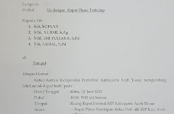 Kemudian kata Muzakkir, menindak lanjuti SK KPU RI itu, Plt Ketua KIP Aceh Timur, Yusri mengundang empat komisioner lainnya pada Senin, 13 Juni 2022 dalam hal undangan rapat pleno tertutup yang akan digelar pada Rabu, 15 Juni 2022 ( Hari ini_Red) tentang penetapan ketua definif KIP Aceh Timur periode 2018- 2023.