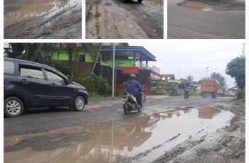Jalan Lintas Provinsi Bagaikan Berlubang Mirip Kubangan Kerbau di Desa Tiang Layar Pancur Batu