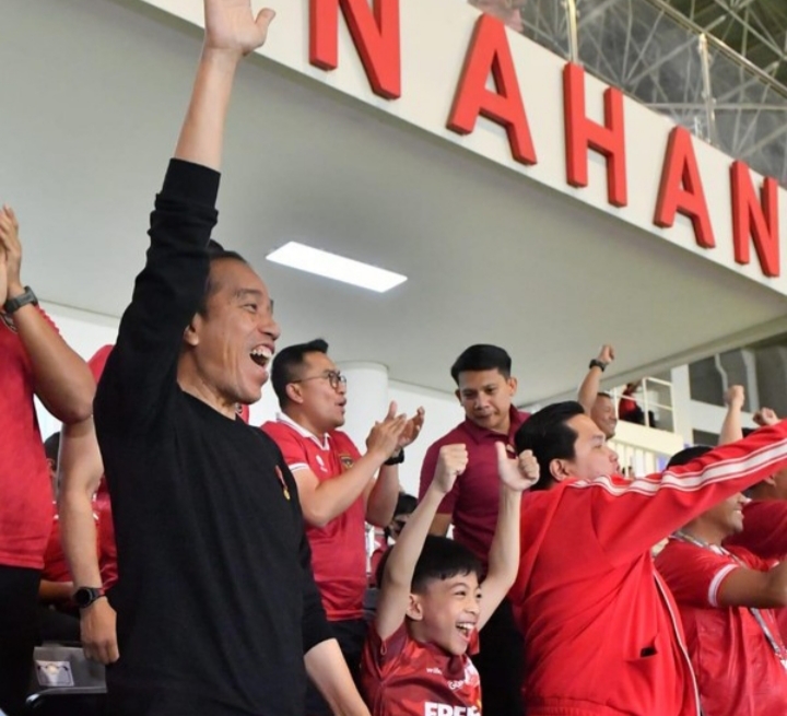 Saat timnas Indonesia mencetak gol, Jokowi yang mengenakan kaus lengan panjang hitam pun bersorak sambil mengangkat tangan kirinya. Dia memberi jempol ke arah lapangan, sebagaimana dikutip ews.detik.com