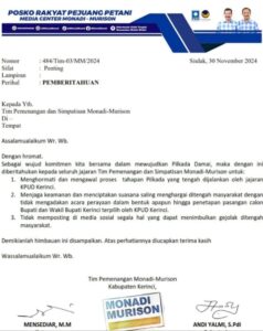 Dimana berdasarkan surat pemberitahuan Nomor : 484/Tim-03/MM/2024 yang ditandatangani langsung oleh Ketua dan Sekretaris Tim pemenangan Monadi – Murison yang ditujukan kepada Tim Pemenangan dan Simpatisan Monadi-Murison, dengan isi yakni Sebagai wujud komitmen kita bersama dalam mewujudkan Pilkada Damai, maka dengan Ini diberitahukan kepada seluruh jajaran Tim Pemenangan dan Simpatisan Monadi-Murison untuk: