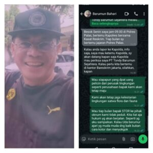 Dalam pesan singkat yang diterima Forester, Bahari menyatakan hubungannya yang intens dengan aparat kepolisian. “Besok Senin saya jam 09.00 di Polres Palas, bertemu Kapolres bersama Kasat Reskrim. Tiap bulan saya bertemu jajaran Polres Palas,” tulis Bahari.