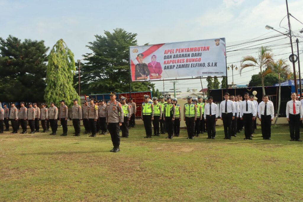 Kepolisian Resor Bungo menggelar Apel Tradisi Penyambutan Kapolres Bungo yang baru, AKBP Zamri Elfino, S.I.K, pada Minggu (8/3/2026) sekira pukul 08.00 WIB di Lapangan Apel Mapolres Bungo. Kegiatan tersebut berlangsung khidmat dan dihadiri oleh unsur Forkopimda serta seluruh jajaran Polres Bungo.