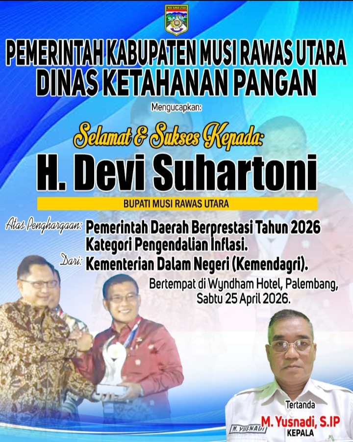 Kepala Dinas Ketahanan Pangan Kabupaten Musi Rawas Utara (Muratara),M. Yusnadi, S.IP, menyampaikan ucapan selamat dan sukses kepada Bupati Muratara, H. Devi Suhartoni, atas prestasi membanggakan yang diraih dalam bidang pengendalian inflasi tahun 2026.