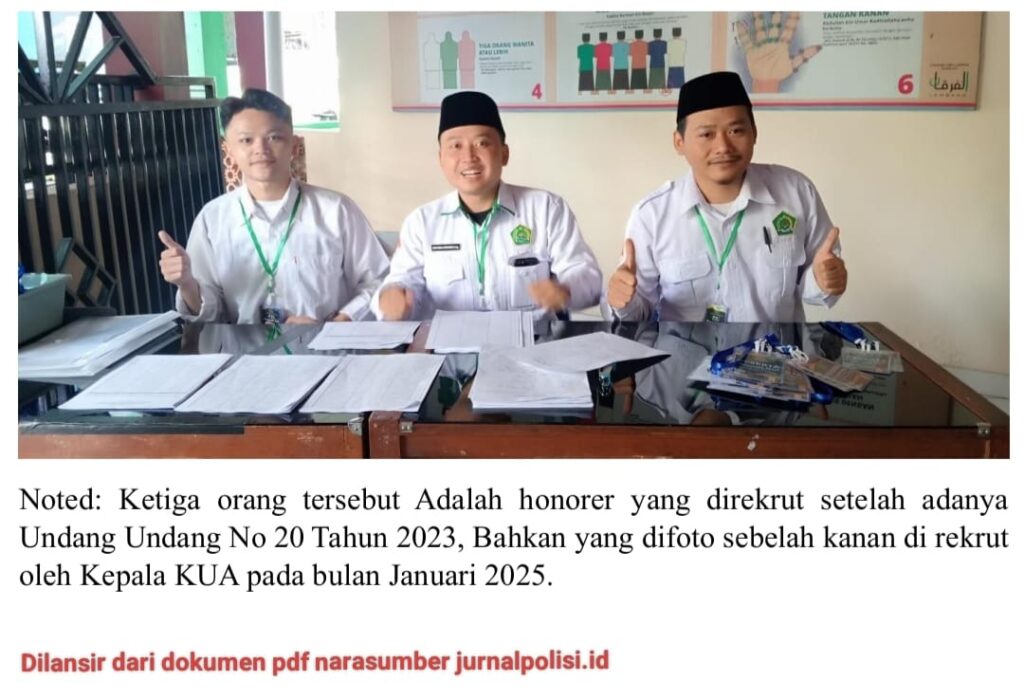 Berdasarkan bukti-bukti, melalui dokumen pdf narasumber membeberkan, Kepala KUA Kecamatan Lembang merekrut kembali tenaga honorer, yang mana aturan tersebut melarang Pejabat Pembina Kepegawaian (PPK) dan pejabat lainnya mengangkat pegawai non-ASN atau tenaga honorer untuk mengisi jabatan ASN setelah Undang-Undang Nomor 20 Tahun 2023 tentang Aparatur Sipil Negara (ASN) berlaku.