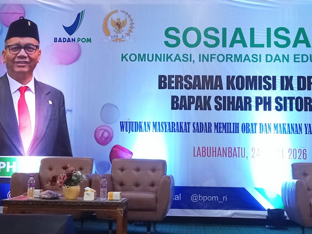 Sosialisasi Komunikasi, Informasi dan Edukasi( KIE ) Bersama Komisi IX DPR RI Sihar PH Sitorus dan menghadirkan Nara sumber Kepala Balai Besar POM Sumatra utara Mojaza Sirait, S.Si., Apt., M.M. pada Jum’at 24/4/2026 di Rantau prapat Jalan Ika Bina Kampung Baru Aula Rantau prapat Convention center ( RPCC )