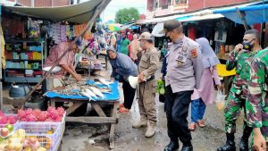 Dengan menggunakan toa, Personil gabungan TNI-Polri dan Sat Pol PP Kec. Makassar secara bergantian mengingatkan penjual dan pengunjung pasar terkait penerapan protokol kesehatan