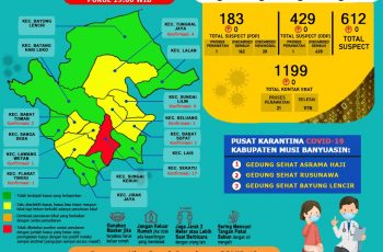 Sementara itu, berdasarkan data update Gugus Tugas Penanganan COVID-19 Muba 16 Desember 2020 tercatat ada sebanyak 426 ODP 411 selesai pemantauan masih dipantau 15 orang, 1.199 kontak erat 1.178 kontak selesai pemantauan 21 kontak erat yang masih dipantau, 183 PDP 1 proses pengawasan 162 selesai pengawasan.(Ilandra)