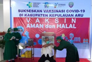 Bupati Kepulauan Aru dr Johan Gonga menjadi orang pertama di Kabupaten Kepulauan Aru, yang menerima suntikan Vaksin Covid-19 perdana pada hari Rabu, (27/1/2021) dengan menerapkan protokol kesehatan. Penyuntikan perdana yang dilaksanakan dilantai 2 Rumah Sakit Umum Daerah (RSUD) Cenderawasi Dobo ini, sekaligus pencanangan Vaksinasi di Kabupaten Kepulauan Aru.