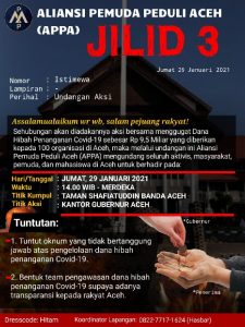 28 Januari 2021 perkumpulan pemuda dan mahasiswa dari elemen Aliansi Pemuda Peduli Aceh (APPA) akan menggelar aksi lanjutan Jilid III terkait penyaluran Dana Hibah yang diberikan kepada 100 OKP di Aceh secara cuma cuma dan banyak pihak menilai tidak tepat sasaran.