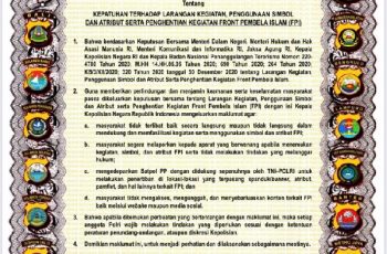 Pelarangan kegiatan FPI tertuang pada Keputusan Nomor:220-4780 Tahun 2020; M.HH 14.HH.05.05 Tahun 2020; 690 Tahun 2020; 264 Tahun 2020;KB/3/XII/2020; 320 Tahun 2020 tanggal 30 Desember 2020 tentang Larangan Kegiatan,Penggunaan Simbol dan Atribut Serta Penghentian Kegiatan Front Pembela Islam.