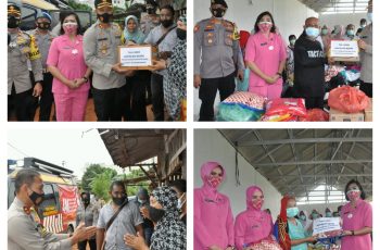 Kapolres Tanjungpinang AKBP Fernando, S.H, S.I.K., bersama Ketua Bhayangkari Cabang Tanjungpinang Ny. Mourine Fernando dan pengurus menyerahkan bantuan sembako dan tali asih tersebut langsung kepada warga yang menjadi korban banjir.