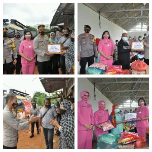 Kapolres Tanjungpinang AKBP Fernando, S.H, S.I.K., bersama Ketua Bhayangkari Cabang Tanjungpinang  Ny. Mourine Fernando dan pengurus menyerahkan bantuan sembako dan tali asih tersebut langsung kepada warga yang menjadi korban banjir.