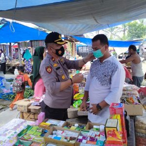 Rombongan Kapolsek ini menyambangi para pedagang dan pengunjung pasar, dan meminta seluruh warga yang berada di Pasar Muara Mahat Baru ini untuk menerapkan protokol kesehatan guna mencegah penyebaran Covid-19.