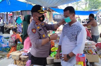 Pada kesempatan ini Kapolsek bersama anggotanya juga membagikan masker kepada para pedagang dan pengunjung pasar yang tidak memiliki masker, warga yang menerima masker ini diminta langsung memakainya dan diingatkan agar selanjutnya terus menggunakan masker terutama saat keluar rumah.