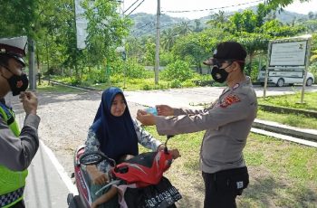 KLU-NTB – Jurnalpolisi.id 26-3-2021Guna mencegah lonjakan Claster baru Covid 19, Sat Binmas Polres Lotara lakukan giat sosialisasi 5M dan membagikan masker ke warga. Berbagai upaya terus digalakkan oleh Kepolisian Resor Lombok Utara dan jajaran untuk mencegah penularan Virus Corona atau covid-19, diantaranya memberikan imbauan, penyemprotan disinfektan di sejumlah tempat-tempat ibadah, pasar, sekolah, kantor dan pasilitas umum. Hari ini, Satuan Binmas Polres Lotara menggelar kegiatan Gebrak Masker (Gerakan Bersama Memakai Masker), dan Sosialisasi 5 M bertempat di jalan raya malaka kecamatan pemenang KLU, Jumat (26/3/2021). Usai melaksanakan apel pagi, personil Sat Binmas dipimpin Ps Kanit Binkamsa Bripka Hairul Taufik membagikan masker kesehatan kepada masyarakat yang melitas tanpa menggunakan Prokes saat itu. Dengan penuh Humanis, personil Sat Binmas membagikan puluhan masker dengan sasaran masyarakat yang tidak mengenakan masker saat beraktivitas. Kapolres Lotara AKBP Feri Jaya Satriansyah, Melalui KBO Sat Binmas IPTU Agus sugianto, SH menyampaikan Tujuan Kita bagi masker ini sebagai upaya untuk lebih meningkatkan kesadaran dan kepedulian masyarakat terhadap perlindungan diri sendiri, serta keluarga dan orang lain di sekitarnya”kata IPTU Agus “Dan Kita akan melakukan kampanye secara masif ke masyarakat tentang 5 M Memakai Masker, Mencuci Tangan, menjaga Jarak, menjauhi kerumunan dan mengurangi mobilitas, sehingga upaya memutus mata rantai covid-19 dapat betul-betul terwujud” pungkas KBO Binmas/ Wiswa (JPN NTB)