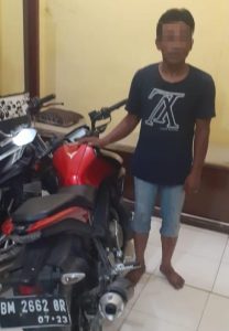 Bersama pelaku juga diamankan barang bukti satu unit sepeda motor Yamaha Vixion Nopol BM-2662-OR warna Merah Hitam dan kunci kontak sepeda motor tersebut.