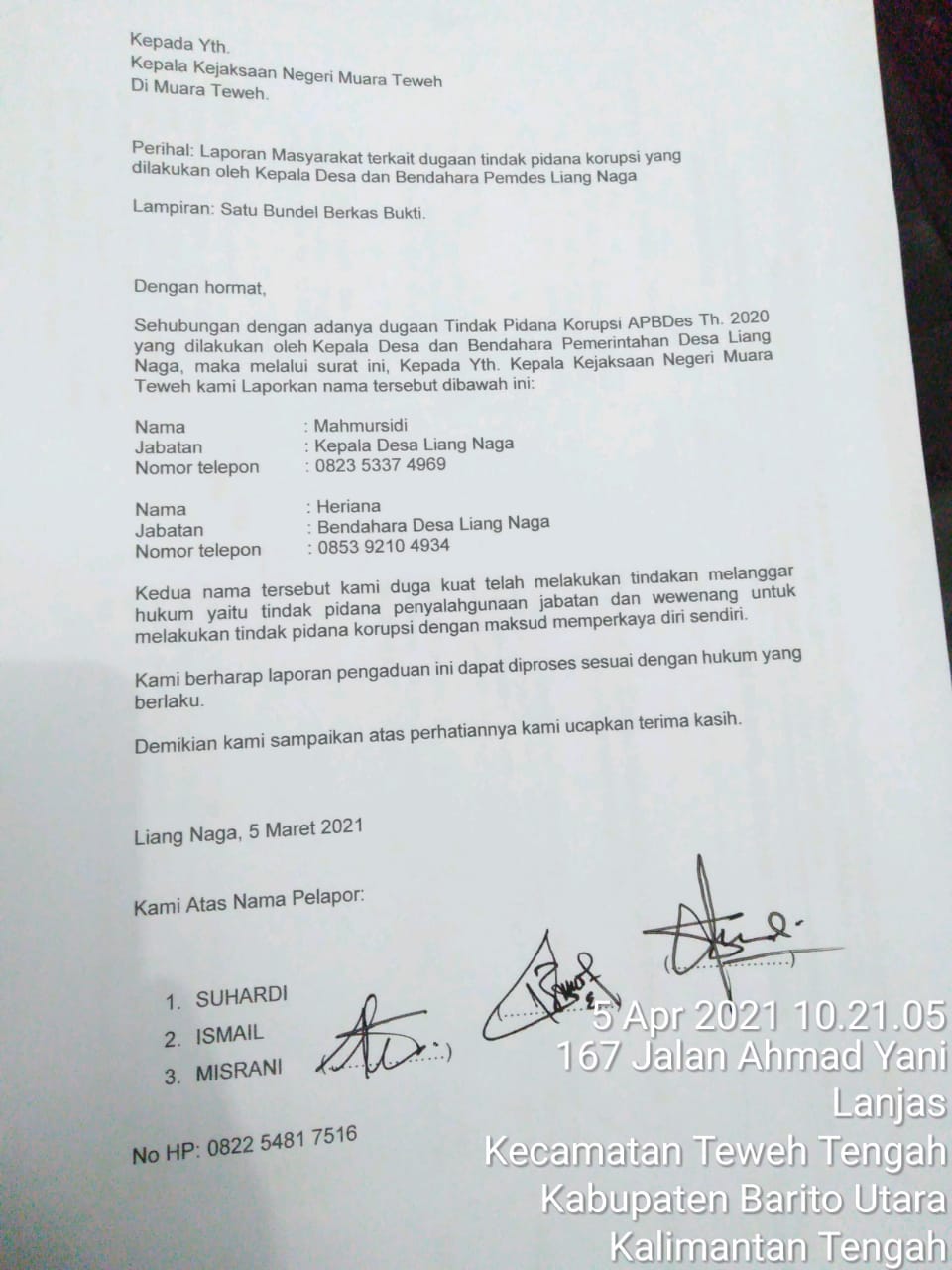 Muara Teweh – Jurnalpolisi.id   Mahmursidi, Kades Liang Naga dan Heriana, Bendahara Desa Liang Naga Kec. Teweh Baru, Kab.Barito Utara, Kalimantan Tengah, akhirnya dilaporkan   3 orang Mantan Pejabat Desa Liang Naga ke Kejaksaan Negeri Muara Teweh. Tanggal pelaporan tertera dalam Surat Laporan Masyarakat terkait dugaan tindak Pidana Korupsi yang dilakukan oleh Kepala Desa dan Bendahara Desa Liang…