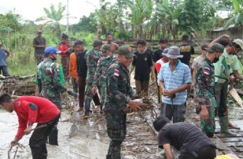 Satgas Yonif 131 Bersama Warga Bersihkan Sampah di Jembatan Dusun Tuwi