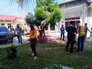 Pelalawan,Jurnalpolisi.id 25/6-21. Dalam rangka menyambut Hari Ulang Tahun (HUT) Bhayangkara ke-75 Tahun 2021, Kepolisian Sektor Ukui bersama pihak kecamatan, kelurahan, dan organisasi masyarakat di Kecamatan Ukui melakukan gotong royong di tempat ibadah (Masjid) dan Pasar Baru Kelurahan Ukui pada Jum’at, 25 Juni 2021. Ikut serta dalam kegiatan tersebut Kapolsek Ukui AKP Rifendi, S.Sos.,M. Si, Kanit Intelkam Dedy L. Tobing, Kanit Lantas Dede Ismanto, Lurah Ukui Yulius Effendi, SE, Kasi Trantib Kecamatan Ukui Basirun Mawad, S.IP, anggota Satpol Kecamatan Ukui, anggota Senkom, dan Karang Taruna Kecamatan Ukui. AKP Rifendi, S.Sos.,M. Si menyampaikan bahwa kegiatan yang dilakukan bersama dengan masyarakat setempat adalah dalam rangka memperingati hari Bhayangkara ke-75 Tahun 2021. “Kegiatan ini merupakan bentuk ibadah dan kepedulian kita terhadap lingkungan dengan cara bakti sosial membersihkan lingkungan sekitar, terutama tempat ibadah dan tempat umum yang sering dilakukan aktifitas oleh masyarakat.Selain itu kegiatan ini, kita lakukan untuk memberikan rasa nyaman kepada masyarakat yang akan melakukan aktifitas, terutama yang melakukan ibadah dan melakukan jual beli di Pasar Baru kelurahan Ukui.” Lebih lanjut Kapolsek juga mengimbau kepada lapisan masyarakat Kecamatan Ukui, terutama yang berada di tempat umum untuk selalu menjaga kebersihan dan melaksanakan protokol kesehatan saat berkegiatan di luar rumah dengan cara memakai masker, selalu mencuci tangan pakai sabun dan menghindari kerumunan. Hal tersebut terkait dengan angka penyebaran Covid-19 di Indonesia yang masih tinggi sehingga masyarakat harus disiplin dalam penerapan protokol kesehatan guna mencegah penyebaran virus Covid-19. Loches Ather Simanjuntak.