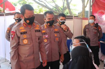 Serang – jurnalpolisi.id Kapolda Banten Irjen pol Dr Rudy Heriyanto Adi Nugroho S.H.,M.H.,M.B.A Didampingi Wakapolda Banten Brigjen Pol Drs. Ery Nursatari.,M.H dan PJU Polda Banten meninjau langsung Proses vaksinasi Serentak kepada ribuan Masyarakat Vaksinasi Massal Serentak ini digelar di lapangan tembak bharadaksa Mapolda Banten dimulai dari pukul 07.00 wib, Hari Sabtu, 26/6/2021. Saat ditemui Kapolda Banten Irjen pol Dr Rudy Heriyanto Adi Nugroho S.H.,M.H.,M.B.A menyampaikan bahwa proses vaksinasi Massal ini sangat menerapkan Protokol Kesehatan secara ketat. “Ratusan personel melayani proses vaksinasi, dimulai dari pengecekan protokol kesehatan saat masuk, pengecekan saat pendaftaran, saat di suntik vaksin hingga observasi setelah disuntik vaksin secara humanis,” Kata Rudy Heriyanto Lebih Lanjut Rudy Heriyanto menyampaikan vaksinasi ini untuk Semua Masyarakat Provinsi Banten yang berusia 18 Tahun ke atas dengan Syarat membawa Foto Copy KTP Provinsi Banten “Antusiasme masyarakat yang melakukan vaksinasi di Polda Banten sangat luar biasa, mereka sangat senang akan divaksin,” ujar Rudy Heriyanto Saat meninjau langsung Rudy Heriyanto berbincang akrab dengan masyarakat yang akan divaksin “Tenang, rileks aja pak engga sakit ko di vaksin, setelah divaksin akan melindungi dan memperkuat sistem kekebalan tubuh secara menyeluruh,” kata Kapolda Banten sambil bercanda ria dengan masyarakat yang akan Vaksinasi Sementara itu Kabidhumas Polda Banten Kombes Pol Edy Sumardi menyampaikan Polda Banten dan Polres jajaran secara serentak melakukan vaksin kepada puluhan ribu orang “vaksinasi massal ini bertujuan untuk mendukung program pemerintah dalam memutus mata rantai penyebaran covid-19 di Indonesia,”ujar Edy Sumardi. Terakhir, Edy Sumardi juga mengajak kepada seluruh masyarakat untuk mendukung program vaksinasi tersebut. “Mari kita dukung program vaksinasi, buat masyarakat jangan takut untuk di vaksin. Karena melalui vaksinasi ini dapat menumbuhkan kekebalan pada tubuh sehingga dapat mencegah penularan virus Covid-19.”tutup Edy Sumardi. (Am/Bidhumas)