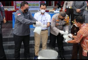 SULTENG – jurnalpolisi.id Palu, Untuk menghapus persepsi negatif masyarakat terhadap barang bukti sitaan narkotika jenis sabu hasil tangkapan, Ditresnarkoba Polda Sulteng pagi ini melakukan pemusnahan narkotika jenis sabu seberat 1.7 Kg, Jumat (23/7/2021) Barang bukti sabu tersebut merupakan hasil tangkapan ditresnarkoba Polda Sulteng pada awal Juli 2021 dengan tersangka sebanyak tiga orang yang merupakan kelompok Tatanga Palu, Jelas Dirresnarkoba Polda Sulteng Kombes Polisi Aman Gantoro dalam laporan pelaksanaan pemusnahan barang bukti yang dilaksanakan di Polda Sulteng, Sementara itu Kapolda Sulteng dalam sambutannya diwakili Irwasda Polda Sulteng Kombes Polisi Ai Afriandi menyatakan, “ pemusnahan barang bukti sitaan narkotika jenis sabu seberat 1,7 Kg oleh Ditresnarkoba Polda Sulteng, berarti Polda Sulteng telah menyelamatkan masyarakat Sulawesi Tengah dari bahaya narkotika sebanyak 14.217 orang,” Kapolda Sulteng juga mengharapkan agar masyarakat Sulawesi Tengah terus berperan aktif untuk membantu melakukan pencegahan dan pemberantasan peredaran gelap Narkotika untuk menyelamatkan masyarakat, bangsa dan negara dari kejahatan Narkotika, harapnya. Pemusnahan barang bukti narkotika jenis sabu dilakukan dengan menuangkan didalam air yang mendidih, kemudian air rebusan dibuang diparit, acara pemusnahan barang bukti turut dihadiri perwakilan Kajati Sulteng, Pengadilan Tinggi Sulteng, Kejari Palu, Kepala Balai POM Palu dan media. (Anto D)