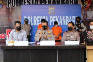 PEKANBARU – jurnalpolisi.id Surat keterangan hasil test Swab menjadi syarat perjalanan transportasi udara, khususnya pesawat terbang. Sayangnya hal ini dimanfaatkan kembali oleh oknum yang tak bertanggung jawab. Jum’at, 02/07/2021 Polresta Pekanbaru melangsungkan Konferensi Pers Tindak Pidana Kasus Pemalsuan Dokumen/Surat hasil test Swab yang digunakan untuk melakukan perjalanan melalui pesawat terbang. Kapolresta Pekanbaru Kombes Pol H. Nandang Mu’min Wijaya, S.I.K.,M.H memimpin langsung Konferensi Pers dan didampingi Kasat Reskrim Polresta Pekanbaru Kompol Juper Lumban Toruan, S.I.K.,S.H dan Kapolsek Bukit Raya AKP Arry Prasetyo, S.H.,M.H serta Kasubbag Humas Polresta Pekanbaru IPTU Said Khairul Iman, S.H.,M.H Dalam Konferensi Pers itu Kapolresta Pekanbaru menjelaskan awal kronologis kejadian. Pada hari Selasa, 29/06/2021 saat tersangka HH (38) yang akan melakukan perjalanan menuju Jakarta melalui Bandara SSQ II Pekanbaru, pada saat Validasi dilakukan pengecekan ternyata surat hasil test Swab yang dimilikinya tidak valid, sehingga pihak KKP Bandara melaporkan kejadian tersebut kepada Polsek Bukit Raya. Setelah itu Personil Bukit Raya langsung mendatangi tempat kejadian dan langsung mengintrogasi tersangka. Berdasarkan hasil keterangan tersangka HH mengakui bahwa surat yang dimilikinya memang benar palsu, HH mengakui telah memerintahkan tersangka JO (26) yang merupakan karyawannya untuk membuatkan surat berupa hasil Labotorium Pcr Covid-19 dari salah satu rumah sakit yang ada di kota Pekanbaru dengan hasil negatif agar HH bisa melakulan perjalanan ke Jakarta. Sehingga tersangka HH dan barang bukti berupa 1 lembar hasil Swab Pcr, 1 buah KTP, 1 lembar Boarding Pas City Link dan 1 lembar kode booking tiket City Link dibawa ke Polsek Bukit Raya untuk dilakukan penyelidikan. Dari hasil pengembangan pada hari Rabu, 30/06/2021 Polsek Bukit Raya berhasil mengamankan tersangka JO di Jl. SM. Yamin Kec. Tampan yang merupakan kantor milik HH dan juga berhasil mengamankan barang bukti berupa 1 unit Laptop dan 1 unit Printer. “Jadi tersangka HH ini tidak melewati prosedur yang semestinya untuk bisa mendapatkan hasil Swab yang sesuai dengan aturan” Tutur Kapolresta Pekanbaru. Atas kejadian tersebut, 2 tersangka dikenakan pasal 263 dan atau pasal 268 K.U.H.Pidana tentang pemalsuan surat atau menggunakan surat palsu atau memalsukan surat keterangan dokter. Kapolresta Pekanbaru juga menuturkan, ini merupakan suatu keberhasilan Polsek Bukit Raya yang bekerjasama dengan petugas KKP bandara SSQ II kota Pekanbaru untuk mengungkap para pelaku Pemalsuan surat hasil Swab yang seolah-olah dikeluarkan oleh salah satu rumah sakit. “Kita sangat apresiasi kinerja Polsek Bukit Raya dan Petugas KKP Bandara Sultan Syarif Qasim II kota Pekanbaru, apalagi saat ini kita benar-benar sedang berjuang dalam memutus mata rantai Penyebaran Covid-19” ungkap Nandang.( anto d)