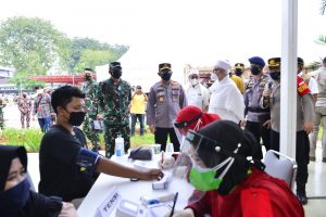 JAKARTA- jurnalpolisi.id Panglima TNI Marsekal TNI Hadi Tjahjanto bersama Kapolri Jenderal Listyo Sigit Prabowo meninjau lokasi vaksinasi massal di Cibis Park Jalan TB Simatupang, Jakarta Salatan, Selasa (6/7/2021). Kegiatan ini dilaksanakanmulai tanggal 6 sampai 8 Juli 2021 bekerja sama dengan organisasi massa (Ormas) Islam Rabithah Alawiyah dengan target vaksinasi sebanyak 4.500 orang. Sementara target per hari 1.000 s.d 1.500 orang per hari dengan sasaran masyarakat umum. “Stok vaksin yang dipersiapkan dalam kegiatan ini sebanyak 4.500 dosis jenis Sinovac. Sedangkan petugas vaksinator yang dilibatkan dalam kegiatanini sebanyak 25 orang terdiri 20 Polri dan 5 TNI,” kata Kapolri dalam keterangannya. Selain di Cibis Park, Panglima dan Kapolri juga mengunjungi vaksinasi massal di kantor Himpunan Pengusaha Muda Indonesia (HIPMI) dan Pusat Pelatihan SDM Kementerian Kesehatan *( Icky) Sumber :(Kemenkes).