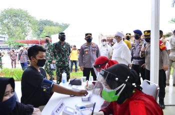 JAKARTA- jurnalpolisi.id Panglima TNI Marsekal TNI Hadi Tjahjanto bersama Kapolri Jenderal Listyo Sigit Prabowo meninjau lokasi vaksinasi massal di Cibis Park Jalan TB Simatupang, Jakarta Salatan, Selasa (6/7/2021). Kegiatan ini dilaksanakanmulai tanggal 6 sampai 8 Juli 2021 bekerja sama dengan organisasi massa (Ormas) Islam Rabithah Alawiyah dengan target vaksinasi sebanyak 4.500 orang. Sementara target per hari 1.000 s.d 1.500 orang per hari dengan sasaran masyarakat umum. “Stok vaksin yang dipersiapkan dalam kegiatan ini sebanyak 4.500 dosis jenis Sinovac. Sedangkan petugas vaksinator yang dilibatkan dalam kegiatanini sebanyak 25 orang terdiri 20 Polri dan 5 TNI,” kata Kapolri dalam keterangannya. Selain di Cibis Park, Panglima dan Kapolri juga mengunjungi vaksinasi massal di kantor Himpunan Pengusaha Muda Indonesia (HIPMI) dan Pusat Pelatihan SDM Kementerian Kesehatan *( Icky) Sumber :(Kemenkes).