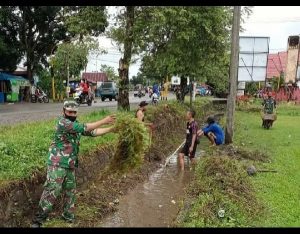 Jumat Bersih,Babinsa Sertu Ambo Upe,dan Serda Burhanuddin, Bersama Pemuda Tim Bencana Alam Giat Pembersihan Saluran Drenase.