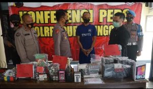 Purbalingga – jurnalpolisi.id Satreskrim Polres Purbalingga berhasil mengungkap kasus pencurian dengan pemberatan yang terjadi di salah satu toko vape wilayah Kelurahan Kalikabong, Kecamatan Kalimanah, Kabupaten PurbaIingga. Tersangka berhasil diamankan berikut puluhan barang buktinya hasil kejahatannya. Kabag Operasi Polres Purbalingga Kompol Pujiono saat memberikan keterangan, Selasa (31/8/2021) mengatakan bahwa tersangka yang diamankan yaitu EP (29) warga Desa Bodaskarangjati, Kecamatan Rembang, Kabupaten PurbaIingga. Tersangka membobol toko vape milik R. Yohan Prayuda Kusuma (28) warga Kelurahan Ledug, Kecamatan Kembaran Kabupaten Banyumas. Korban memiliki toko vape bernama Bukan Vape Store di wilayah Kelurahan Kalikabong, Kabupaten PurbaIingga. “Modus yang dilakukan, tersangka menggunakan kunci palsu untuk masuk ke dalam toko melalui pintu belakang. Selain itu, mencongkel gembok dengan gunting yang sudah disiapkan,” jelas Kabag Ops didampingi Kasat Reskrim AKP Gurbacov dan Kasi Humas Iptu Muslimun. Dijelaskan bahwa tersangka tinggal di tempat kos yang lokasinya dekat dengan toko vape tersebut. Sehingga ia sudah melakukan pengamatan dan pengintaian sasaran yang akan dilakukan pencurian. Kemudian beraksi melakukan pencurian pada Senin (2/8/2021) dini hari sekira jam 01.30 WIB. “Akibat pencurian korban mengalami kerugian mencapai lebih dari Rp. 35 juta. Karena puluhan barang terkait vape atau rokok elektrik yang ada di dalam toko hilang dibawa kabur tersangka,” jelasnya. Atas laporan korban, kemudian dilakukan upaya penyelidikan oleh Unit Resmob Polres Purbalingga. Tersangka kemudian berhasil diidentifikasi dan selanjutnya dilakukan penangkapan berikut sejumlah barang buktinya. Dari tangan tersangka diamankan barang bukti peralatan yang terkait dengan rokok elektrik. Diantaranya 26 RDA (Rebuidabel Dripping Atomizer), 38 POD atau rokok elektrik kecil, 26 MOD atau alat penyimpanan sumber kelistrikan vape, 94 botol liquid atau cairan perasa rokok elektrik, 92 buah coil POD, 13 buah coil MOD, 33 kapas sumbu pembakar. Diamankan pula satu tablet android, kunci pintu palsu dan gunting. “Selain itu, diamankan juga uang sebesar Rp. 350 ribu hasil penjualan barang curian yang sempat dijual tersangka secara online maupun COD,” jelasnya. Dari data yang didapat, tersangka merupakan residivis dan sudah pernah diproses hukum akibat melakukan pencurian. Pencurian dilakukan tersangka di wilayah Kabupaten Cirebon, Jawa Barat saat bekerja di sana. Dari keterangan tersangka ia yang bekerja sebagai wiraswasta nekat melakukan pencurian karena membutuhkan uang. Menurutnya selama pandemi Covid-19 dirinya mengalami penurunan penghasilan untuk menghidupi istri dan seorang anak. Kabag Operasi menambahkan atas tindakannya, tersangka dikenakan Pasal 363 ayat (1) ke-3 dan ke-5 KUHP tentang Pencurian dengan Pemberatan. Ancaman hukuman pasal tersebut yaitu pidana penjara selama tujuh tahun. ( Arif Akhmad JPN)