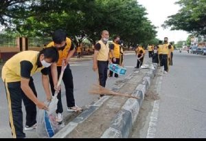 PALU- jurnalpolisi.id Ada yang berbeda di Jalan Soekarno Hatta Palu sejak pagi 06.30 wita, terlihat ratusan orang bermasker dengan berseragam training olah raga kuning hitam menyerbu lintasan jalan mako Polda Sulteng itu, ternyata mereka adalah ratusan personil Polri yang melaksanakan kerja bakti untuk menyambut HUt Kemerdekaan RI ke -76. Dengan membawa peralatan kurve seperti skop, sapu lidi, sabit dan parang, personil Polda Sulteng tersebut serentak melakukan pembersihan baik di median dua jalur jalan soekarno hatta maupun dibahu kanan kiri jalan. “Berbagai macam cara dapat dilakukan untuk menyambut Hari Kemerdekaan Republik Indonesia ke 76 dan Polda Sulteng melakukannya dengan kerja bhakti bersama,” demikian antara lain penjelasan Kabidhumas Polda Sulteng Kombes Pol. Didik Supranoto di Palu, Jumat (13/8/2021).Selain itu Polda Sulteng juga sangat mendukung program Pemerintah Kota menuju Palu Adipura 2023, jelasnya. Pelaksanaan kerja bhakti diikuti seluruh personil satker Polda Sulteng dan Polres Palu, berlangsung mulai pukul 06.30 s.d 08.30 wita. Semoga apa yang dilakukan oleh Polda Sulteng dapat memotivasi masyarakat Kota Palu untuk mendukung pemerintah Kota menuju Kota Palu Adipura 2023 dengan melaksanakan kebersihan mulai dari tingkat RT, RW, Kelurahan dan Kecamatan di Kota Palu, tutur.Didik-(is)