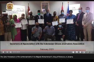 Jakarta – jurnalpolisi.id Kedutaan Besar (Kedubes) Maroko di Indonesia merayakan Hari Nasional Kerajaan Maroko pada Jumat, 30 Juli 2021, bertempat di Kediaman Resmi Dubes Maroko, Jakarta Selatan. Perayaan Hari Nasional Maroko, yang merupakan peringatan 22 tahun King Mohammed VI naik tahta menjadi Raja Maroko, itu dapat disaksikan secara online melalui tautan virtual youtube. Kedubes Maroko mengundang beberapa pihak untuk hadir menyaksikan acara tersebut, antara lain para Perwakilan Kedutaan Besar Negara Sahabat yang ada di Indonesia dan Kementerian/Lembaga Republik Indonesia serta mitra-mitra kerja Kedubes Maroko. Sebagaimana di tahun-tahun sebelumnya, Kedubes juga mengundang Ketua Umum PPWI, Wilson Lalengke untuk hadir menyaksikan acara Perayaan Hari Nasional Maroko tahun 2021 ini. Acara diawali dengan memperdengarkan lagu kebangsaan kedua negara, Hymne Cherifien dan Indonesia Raya. Usai mendengarkan lagu kebangsaan dari kedua bangsa bersahabat ini, berturut-turut hadirin menyimak pidato Dubes Maroko dan Menteri Perencanaan Pembangunan Nasinal / Kepala Bappenas, Suharso Manoarfa. Dalam acara yang dilaksanakan secara sederhana itu, Dubes Maroko, H.E. Mr. Ouadia Benabdellah, menyampaikan terima kasih yang sebesar-besarnya kepada Pemerintah Indonesia atas kerjasama diplomatik yang sudah terlajin lebih dari 60 tahun. Pemerintah Maroko, demikian Dubes, sangat menghargai kolaborasi yang tercipta selama ini antara kedua negara, yang tidak hanya sekadar hubungan yang bersifat diplomatik, ekonomi, dan kerjasama resmi lainnya semata, tapi juga eratnya hubungan persahabatan yang dilandasi oleh rasa persaudaraan, ikatan keagamaan, solidaritas, dan prinsip persatuan dan kedaulatan negara. Dubes Maroko juga menjelaskan berbagai capaian yang telah terealisasi dalam program khusus 60 tahun hubungan Indonesia – Maroko. Walaupun kedua bangsa sedang menghadapi masalah pandemi Covid-19, namun beberapa kegiatan bersama dapat dilaksanakan dengan mematuhi protokol kesehatan dengan ketat. Beberapa program kegiatan itu antara lain, berdirinya Dewan Kerjasama Perdagangan dan Investasi Indonesia – Maroko (DK PRIMA), penyelenggaraan webinar bersama CGEM (Kadin Maroko) dengan Kadin Indonesia, dan Pekan Kuliner Maroko di Jakarta. Di bagian akhir pidatonya, Dubes Ouadia Benabdellah menginformasikan bahwa Pemerintah Kerajaan Maroko telah tuntas memvaksinasi seluruh warga negaranya dan warga asing yang ada di Maroko. Keberhasilan itu telah menekan penularan virus Covid-19 secara signifikan dan menjadikan Maroko sebagai negara pertama di benua Afrika yang telah tuntas memberikan vaksinasi bagi rakyatnya. Sementara itu, Menteri PPN/Bappenas, Suharso Manoarfa, dalam sambutannya menyampaikan selamat kepada Pemerintah Kerajaan Maroko bersama seluruh rakyatnya yang sedang merayakan Hari Nasional-nya. Menteri Manoarfa berharap hubungan kerjasama yang sudah terjalin selama ini akan lebih meningkat di masa-masa yang akan datang di berbagai bidang. Menteri juga memaparkan berbagai keberhasilan yang telah dicapai oleh kedua negara, termasuk dalam hal penanganan terorisme dan pemeliharaan perdamaian dunia. Manoarfa tidak lupa menyampaikan terima kasih atas pemberian dan penambahan kuota beasiswa bagi pelajar Indonesia yang ingin melanjutkan pendidikan di Maroko. Di saat yang sama, Ketua Umum PPWI, Wilson Lalengke, menyampaikan Selamat dan Sukses bagi Pemerintah dan seluruh rakyat Maroko atas perayaan Hari Penobatan yang ke-22 tahun Raja Maroko, King Mohammed VI, pada 30 Juli 2021. _“Congratulation on the 22nd anniversary of the enthronement of His Majesty Mohammed VI, King of Morocco. I wish all the best for His Majesty, the entire Moroccan, and Your Excellency Mr. Ouadia Benabellah,”_ ujar Wilson Lalengke yang juga merupakan Presiden Persaudaraan Indonesia Sahara Maroko (Persisma) itu. Bagi semua pihak, khususnya para jurnalis dan pewarta, yang tidak sempat menyaksikan acara secara live, dapat menonton tayangan video acara dimaksud di laman youtube Kedubes Maroko berikut ini. Pada bagian akhir tayangan ditampilkan berbagai kegiatan Kedubes Maroko, antara lain _‘Ceremony of Appreciation with The Indonesian Citizen Journalists Association’_ yang dilaksanakan oleh Kedubes Maroko bersama PPWI pada 4 Februari 2021 lalu. (PERSISMA/Red). https://youtu.be/qVUDUoiCeIg?