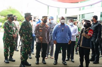 Kab. Bandung, jurnalpolisi.id Didampingi Pangdam III/Siliwangi Mayjen TNI Nugroho Budi Wiryanto, Gubernur Jabar Ridwan Kamil serta Kapolda Jabar Irjen Pol Ahmad Dofiri mendampinggi Panglima TNI Marsekal TNI Hadi Tjahjanto dan Kapolri Jenderal Pol Listyo Sigit Prabowo meninjau pelaksanaan Vaksinasi Covid-19 di PT. Kahatex Jalan Raya Rancaekek Km 23/25 Kab. Bandung, Kamis (5/8/2021). Setibanya di PT. Kahatex, Panglima TNI dan Kapolri langsung melaksanakan peninjauan di lokasi pelaksanaan vaksin dan pemberian sembako secara simbolis kapada buruh. Sedangkan untuk kegiatan vaksinasi ini diikuti lebih kurang 2.500 orang buruh. Dalam kesempatan tersebut, Kapolri Jenderal Pol Lystio Sigit Pramono mengatakan,” hari ini kami datang kesini dalam rangka melaksanakan akselerasi percepatan vaksinasi khusunya bagi buruh yang tergabung dalam KSPSI. Kita tahu bahwa buruh adalah salah satu pahlawan devisa karena dengan kekuatan ekspor yang selama ini dilakukan oleh rekan-rekan buruh maka devisa masuk ke Indonesia. Oleh karena itu, tentunya kita memiliki kewajiban untuk menjaga agar buruh semuanya selalu sehat Kita juga tahu angka penderita Covid 19 kita masih tinggi, sehingga walaupun sudah di vaksin namun demikian tetap patuhi prokes, tetap menggunakan masker setelah melaksanakan vaksinasi, sehingga buruh tetap sehat dan ekonomi tetap tumbuh”. Bersamaan itu pula, Panglima TNI Marsekal TNI Hadi Tjahjanto juga mengatakan,” dalam mengendalikan pandemi Covid-19, strategi yang kita gunakan ada 3. Yang pertama adalah kita menegakkan, mengkapanyekan prokes 3 M yaitu menggunakan masker, menjaga jarak dan mencuci tangan. Yang kedua adalah strategi 3 T yaitu Testing, Tracing dan Treatment dan yang ketiga adalah pelaksanaan Vaksinasi. Menurut Panglima TNI,“ 3 hal ini sangat penting karena saat ini varian yang ada di Indonesia adalah varian Delta yang penularannya jauh lebih cepat dibandingkan varian wuhan dan varian Inggris”. Lebih lanjut dikatakan Panglima TNI,” Termasuk kita melaksanakan berikutnya adalah Tracing. Tracing adalah bagian untuk memisahkan masyarakat yang tidak terinfeksi dan masyarakat yang terinfeksi. Yang terinfeksi tentunya langsung kita laksanakan Treatment baik Isoman, Isoter maupun perawatan di Rumah Sakit. Diakhir lawatannya meninjau Vaksinasi di PT. Kahatex Panglima TNI menuturkan,” apabila 3 strategi tersebut 3 M, 3 T dan Treatment kita laksanakan dengan baik tentunya kita segera terhindar dari Covid-19 namun pelaksanaan 3 strategi tersebut tidak akan bisa berjalan tanpa keikutsertaan seluruh komponen masyarakat karena masing-masing individu dalam kelompok masyarakat maupun komponen masyarakat memiliki arti sangat penting, memiliki peran yang sangat penting mulai dari kewajiban pribadi menggunakan masker sampai kesadaran untuk mau di Tracing dan termasuk kesadaran mau untuk melaksanakan vaksinasi”. Oleh sebab itu, pelaksanaan pengendalian diperlukan satu strategi semesta strategi bersama-sama dan saya lihat di Kota Bandung termasuk hari ini melihat bahwa 3 strategi itu bisa dilaksanakan dengan baik dan insya Allah dalam waktu dekat kita segera mengakhiri pandemi Covid-19 dan ekonomi Indonesia segera maju terbang ke langit,”pungkas Panglima TNI Marsekal TNI Hadi Tjahjanto. (Pendam III/Siliwangi).