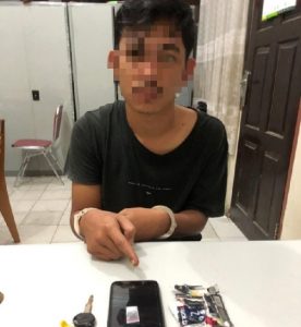 BANGKINANG – jurnalpolisi.id Tim Opsnal Satresnarkoba Polres Kampar ciduk seorang pelaku narkoba di wilayah Desa Bukit Payung Kecamatan Bangkinang, pada Selasa sore (17/08/2021). Tersangka kasus kasus penyalahgunaan narkotika jenis shabu yang diamankan Aparat Kepolisian ini adalah DS alias DI (22), warga Desa Petapahan Kecamatan Tapung, Kabupaten Kampar. Dari pelaku ditemukan barang bukti 1 paket narkotika jenis shabu terbungkus plastik bening, sebuah kotak rokok Merk On Bold yang dijadikan tempat menyimpan shabu, 1 Unit HP Merk Redmi warna hitam dan 1 Unit Sepeda Motor Honda Beat warna Putih dengan Nopol BM-5213-ZP yang digunakan pelaku. Pengungkapan kasus ini berawal pada Selasa (17/08/2021) sekira pukul 16.00 Wib, saat itu Tim Opsnal Satresnarkoba Polres Kampar tengah melakukan penyelidikan, terkait informasi maraknya peredaran narkotika jenis shabu di wilayah Desa Bukit Payung Kecamatan Bangkinang. Dari hasil penyelidikan, Tim mengamankan seorang pria inisial DS alias DI yang dicurigai sebagai pengedar narkotika jenis shabu, selanjutnya didampingi aparat desa setempat dilakukan penggeledahan terhadapnya. Dari hasil penggeledahan, ditemukan dari tersangka ini 1 paket narkotika jenis shabu terbungkus plastik bening dalam kotak rokok merek ON BOLD dan beberapa barang bukti lainnya terkait kasus ini, kemudian tersangka dan barang bukti dibawa ke Polres Kampar untuk menjalani pemeriksaan lebih lanjut. Kapolres Kampar AKBP Rido Purba SIK, MH melalui Kasatres Narkoba AKP Daren Maysar SH saat dikonfirmasi membenarkan penangkapan pelaku narkoba ini, disampaikan bahwa dari hasil pengecekan urine tersangka hasilnya positif Methamphetamine. Kini tersangka dan barang bukti telah diamankan di Mapolres Kampar untuk menjalani proses hukum lebih lanjut, pelaku akan dijerat dengan pasal 114 (1) junto pasal 112 (1) UU nomor 35 tahun 2009 tentang narkotika, dengan ancaman hukuman penjara paling singkat selama 5 tahun, jelasnya. (Anto D)