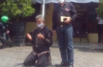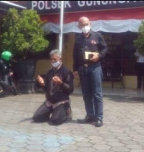 Di dampingi Kuasa Hukumya YOHANES SUGIWIYARNO SH.MH seorang warga Pakintelan, Kecamatan Gunungpati, Kota Semarang melakukan sujud syukur di halaman Mapolsek Gunungpati yang dilakukan oleh Kakek Suryadi 63 paruh baya karena terkabulnya penangguhan penahanan oleh Polsek Gunungpati atas dirinya Selasa (10/8/2021).