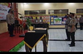 Purbalingga – jurnalpolisi.id Kapolres Purbalingga AKBP Era Johny Kurniawan memimpin serah terima jabatan (Sertijab) Kapolsek Kemangkon. Kegiatan digelar sesuai dengan protokol kesehatan di Aula Loka Anindhita Mapolres Purbalingga, Senin (13/9/2021) sore. Jabatan Kapolsek Kemangkon diserahterimakan dari AKP Imam Hidayat kepada Iptu Wahyudi yang sebelumnya menjabat Wakapolsek Bobotsari. Sedangkan AKP Imam Hidayat selanjutnya melaksanakan tugas sebagai Tenaga Pendidik (Gadik) di SPN Polda Jateng. Kapolres Purbalingga AKBP Era Johny Kurniawan dalam amanatnya menyampaikan bahwa pada hari ini dilaksanakan serah terima jabatan Kapolsek Kemangkon. perubahan jabatan atau mutasi merupakan hal yang sudah biasa dilaksanakan dalam sebuah organisasi. “Hal ini untuk meningkatkan kinerja atau pelayanan kepolisian kepada masyarakat,” kata kapolres. Kapolres menyampaikan ucapan terima kasih kepada pejabat lama atas dedikasi yang sudah diberikan dalam pelaksanaan tugas sebagai Kapolsek Kemangkon. Ucapan terima kasih juga disampaikan untuk Ketua Bhayangkari yang turut berperan dalam mendukung pelaksanaan tugas. “Selamat melaksanakan tugas dan jabatan baru. Semoga di tempat tugas yang baru bisa mencapai kesuksesan,” ucap Kapolres. Kepada pejabat baru, Kapolres berpesan agar segera menyesuaikan diri dengan lingkungan tugas yang baru. Selain itu jalin komunikasi yang baik untuk memberikan pelayanan kepada masyarakat termasuk terkait penanganan Covid-19 di wilayah. Upacara sertijab diisi dengan pengambilan sumpah jabatan pejabat baru oleh Kapolres Purbalingga. Selanjutnya dilakukan penandatanganan berita acara serah terima jabatan dan pakta integritas. ( Arif Akhmad JPN)