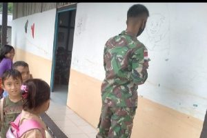 Melukis Peta Indonesia di Dinding TK Anggota Satgas Yonif 144/JY di Batas Negeri