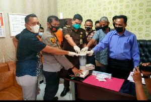 KAMPAR – jurnalpolusi.id Satuan Reserse Narkoba Polres Kampar melaksanakan pemusnahan barang bukti narkotika jenis shabu seberat 96,21 Gram, pemusnahan ini digelar di ruang kerja Kasatres Narkoba, pada Kamis pagi (02/09/2021) sekira pukul 10.00 Wib Narkotika yang dimusnahkan berasal dari 3 ungkap kasus, 2 diantaranya oleh Satresnarkoba Polres Kampar dan 1 kasus lainnya oleh Polsek Kampar Kiri Hilir, yang diungkap pada akhir bulan Agustus 2021 lalu. Pemusnahan barang bukti narkotika ini dipimpin Kasatres Narkoba AKP Daren Maysar SH, dan dihadiri Kapolsek Kampar Kiri Hilir AKP Asdisyah Mursid SH, Perwakilan Pengadilan Negeri Bangkinang oleh Hakim Omori Rotama Sitorus SH, MH, Perwakilan Kejaksaan Negeri Kampar oleh Jaksa Budi Setia Mulya SH, MH. Juga hadir Kasat Tahti (Tahanan dan Barang Bukti) Polres Kampar IPDA Alreflus dan 4 orang tersangka selaku pemilik narkotika yang akan dimusnahkan tersebut, yaitu BS alias BU, RS alias RA, HS alias HL dan NA alias KD. Acara pemusnahan barang bukti Narkotika ini diawali pembacaan kronologi perkara terkait dengan narkotika yang akan dimusnahkan, oleh Kasatres Narkoba AKP Daren Maysar SH. Selanjutnya dilakukan pemusnahan 96,21 Gram narkotika jenis shabu tersebut, dengan cara dilarutkan dalam air kemudian diblender lalu dibuang ketanah. Usai pemusnahan dilakukan penandatanganan Berita Acara Pemusnahan oleh para saksi yang hadir, termasuk ke-empat tersangka pemilik narkotika tangkapan tersebut. Acara pemusnahan barang bukti narkotika ini berakhir sekira pukul 11.00 wib, seluruh rangkaian acara berlangsung dengan lancar dan menerapkan protokol kesehatan, untuk mencegah penyebaran Covid-19. (Anto D)