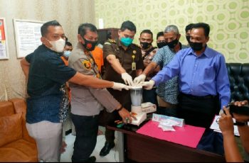 KAMPAR – jurnalpolusi.id Satuan Reserse Narkoba Polres Kampar melaksanakan pemusnahan barang bukti narkotika jenis shabu seberat 96,21 Gram, pemusnahan ini digelar di ruang kerja Kasatres Narkoba, pada Kamis pagi (02/09/2021) sekira pukul 10.00 Wib Narkotika yang dimusnahkan berasal dari 3 ungkap kasus, 2 diantaranya oleh Satresnarkoba Polres Kampar dan 1 kasus lainnya oleh Polsek Kampar Kiri Hilir, yang diungkap pada akhir bulan Agustus 2021 lalu. Pemusnahan barang bukti narkotika ini dipimpin Kasatres Narkoba AKP Daren Maysar SH, dan dihadiri Kapolsek Kampar Kiri Hilir AKP Asdisyah Mursid SH, Perwakilan Pengadilan Negeri Bangkinang oleh Hakim Omori Rotama Sitorus SH, MH, Perwakilan Kejaksaan Negeri Kampar oleh Jaksa Budi Setia Mulya SH, MH. Juga hadir Kasat Tahti (Tahanan dan Barang Bukti) Polres Kampar IPDA Alreflus dan 4 orang tersangka selaku pemilik narkotika yang akan dimusnahkan tersebut, yaitu BS alias BU, RS alias RA, HS alias HL dan NA alias KD. Acara pemusnahan barang bukti Narkotika ini diawali pembacaan kronologi perkara terkait dengan narkotika yang akan dimusnahkan, oleh Kasatres Narkoba AKP Daren Maysar SH. Selanjutnya dilakukan pemusnahan 96,21 Gram narkotika jenis shabu tersebut, dengan cara dilarutkan dalam air kemudian diblender lalu dibuang ketanah. Usai pemusnahan dilakukan penandatanganan Berita Acara Pemusnahan oleh para saksi yang hadir, termasuk ke-empat tersangka pemilik narkotika tangkapan tersebut. Acara pemusnahan barang bukti narkotika ini berakhir sekira pukul 11.00 wib, seluruh rangkaian acara berlangsung dengan lancar dan menerapkan protokol kesehatan, untuk mencegah penyebaran Covid-19. (Anto D)