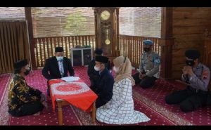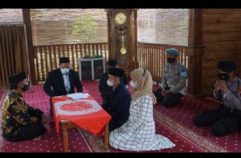 Purbalingga – jurnalpolisi.id Seorang pria berstatus tahanan melangsungkan pernikahan di Polres Purbalingga, Jawa Tengah, Senin (13/9/2021). Pria tersebut merupakan tersangka kasus penyalahgunaan narkoba dan masih harus menjalani proses hukum. Tahanan tersebut menikah dengan kekasihnya di Musjid Ar Rabbani komplek Polres Purbalingga. Akad nikah menghadirkan penghulu dari KUA Kecamatan Kalimanah dan dihadiri oleh wali, orang tua dan saksi. Kegiatan juga mendapatkan penjagaan dan pengawalan ketat dari petugas kepolisian. Kapolres Purbalingga AKBP Era Johny Kurniawan melalui Kasat Tahti Ipda Sapto Wijiono mengatakan bahwa hari ini Satahti Polres Purbalingga memfasilitasi pernikahan salah satu tahanan kasus narkoba. Kegiatan berlangsung di Masjid Ar Rabbani komplek Polres Purbalingga. Tahanan yang melangsungkan pernikahan yaitu RNS (19) warga Kelurahan Kembaran Kulon, Kecamatan/Kabupaten Purbalingga. Ia menikah dengan calon istrinya yang berinisial SS (20) warga Kecamatan Kembaran, Kabupaten Banyumas. “Kegiatan ini merupakan wujud pelayanan Satahti Polres Purbalingga kepada tahanan. Dimana kita berikan hak-hak tahanan untuk melangsungkan pernikahan,” jelasnya. Disampaikan bahwa pelaksanaan pernikahan antara keduanya sebelumnya sudah dijadwalkan. Namun karena mempelai pria tersangkut kasus penyalahgunaan narkoba dan harus menjalani proses hukum, maka pernikahan dilaksanakan di Polres Purbalingga. Dari pantauan kegiatan, prosesi akad nikah berlangsung sederhana dengan menerapkan protokol kesehatan. Usai dilangsungkan akad nikah, pengantin pria tampak menangis haru saat bertemu dan bersalaman dengan kedua orang tuanya. Kemudian pengantin pria kembali masuk ke ruang tahanan Polres Purbalingga. ( Arif Akhmad JPN)