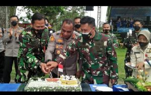 MENGGALA Tulang Bawang – jurnalpolisi.id Kodim 0426 Tulang Bawang menggelar serbuan vaksinasi Covid-19 massal dan bhakti sosial dalam rangka memperingati HUT ke-76 TNI. Dandim 0426 Tulang Bawang, Letkol Kav Joko Sunarto,S.Sos.,M.Han, mengatakan dua kegiatan itu merupakan agenda dalam memperingati hari jadi Tentara Nasional Indonesia atau TNI tahun ini. “Serbuan vaksin kami pusatkan di Puskesmas Tiuh Tohow. Sedangkan untuk bhakti sosial berupa pembagian sembako kami serahkan kepada warga di Kampung Tiuh Tohow, Kecamatan Menggala,” ungkap Joko, Rabu, 6 Oktober 2021. Danlanud Pangeran M Bun Yamin, Letkol Nav Yohanas Ridwan, ST, mengajak seluruh institusi di negeri ini selalu menjaga kekompakan demi terciptanya kedamaian negeri. “Dengan ini kita harus selalu bersinergi dengan baik dan kita tunjukan ke kompakan demi menjaga kedaulatan Negara (NKRI) yang kita banggakan,” kata dia. Di tempat yang sama Kapolres Tulang Bawang, AKBP Hujra Soumena,S.IK.,M.H, turut mengatakan hal senada. Menurut dia, ajakan Danlanud Pangeran M Bun Yamin sesuai dengan tema HUT TNI tahun ini yang mengusung “Bersatu, Berjuang Kita Pasti Menang”. “Mari kita jaga keharmonisan serta kekompakan dan selalu bersinergi,” tegasnya. Dalam kegiatan itu turut dihadiri, Pasi Ops Kodim 0426 Kapten Inf Arif Afuan, Pa Sandi Kodim 0426 Letda Inf Yugo Utomo, Danunit Intel Kodim 0426, Letda Inf Abdul Razak, Kapolsek Menggala, Iptu Holili, Danki Brimob Menggala, Iptu Darwanto,SH, Kapokkesdim 0426, Peltu Anwar Hidayat,S.kep, dan Kepala Puskesmas Tiuh Tohou, Ifra Purwanto,S.Kep.M.,Kes. Peringatan HUT TNI ke-76 ditandai dengan pemotongan tumpeng oleh Kapolres Tulang Bawang, AKBP Hujra Soumena,S.IK.,M.H. dan pemotongan kue oleh Dandim 0426/TB, Danlanud Pangeran M Bun Yamin dan Kapolres Tuba.(Ari)