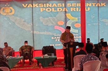 BANGKINANG – jurnalpolisi.id Memperingati Hari Santri Nasional ke-4 tahun 2021, Polda Riau menggelar vaksinasi massal di Pondok Pesantren Hidayatul Salafiyah Desa Utama Karya Kecamatan Kampar Kiri Tengah Kabupaten Kampar, Riau, Jumat (22/10/2021) pagi. Kegiatan ini dihadiri Kapolda Riau Irjen Pol Agung Setya Imam Effendi didampingi beberapa Pejabat Utama Polda Riau, Bupati Kampar H Catur Sugeng Susanto, Kapolres Kampar AKBP Rido Purba, Dandim 0313/ KPR diwakili Kasdim Mayor Arh Gunawan dan Ketua MUI Riau H Ilyas Husti. Irjen Agung beserta rombongan tiba di Ponpes Hidayatul Salafiyah Desa Utama Karya sekira pukul 08.30 WIB dan disambut langsung oleh Bupati beserta Forkopimda Kampar serta Pimpinan Ponpes Hidayatul Salafiyah Desa Utama Karya. Bupati Kampar H Catur Sugeng Susanto menyampaikan terimakasihnya kepada Kapolda Riau, yang menggelar kegiatan vaksinasi masal di wilayah Kabupaten Kampar, Riau. “Terimakasih pak Kapolda, kegiatan ini tentunya berkontribusi dalam mengatasi pandemi Covid-19 dengan terciptanya Herd immunity atau kekebalan komunal bisa tercapai di masyarakat, khususnya dikabupaten Kampar ini,” ujar Catur. Sementara pimpinan Ponpes Hidayatul Salafiyah, Kyai Yasin Yusuf dalam sambutannya mengatakan, rasa kebahagian dan ucapan terima kasih yang sebesarnya atas kunjungan Kapolda Riau di Ponpes Hidayatul Salafiyah Desa Utama Karya, dalam rangka Peringatan Hari Santri Nasional ke-4 dengan menggelar vaksinasi bagi para santri. “Sesuai tema peringatan “Sehat Jiwa Raga”, kita berharap dengan adanya vaksinasi ini para santri menjadi lebih sehat jiwa raga sehingga lebih fokus dalam menuntut ilmu,” kata Kyai Yasin Yusuf. Sementara itu, Kapolda Riau Irjen Agung Setya Imam Effendi menuturkan rasa bahagianya karena hari ini bisa berada ditengah para santri. Apalagi tepat pada Hari Santri Nasional ke-4 tahun 2021. Pemerintah telah menempatkan para santri sebagai bagian utama, karena para santri adalah masa depan bangsa. “Hari ini kita adakan vaksinasi terhadap para santri yang kita targetkan sebanyak 3.000 dosis untuk seluruh Kabupaten Kampar. Hal ini sebagai ikhtiar kita untuk mewujudkan Herd Imunity guna mengatasi Pandemi Covid-19,” ucap jenderal bintang dua ini. “Terimakasih kepada Bupati Kampar dan Forkopimda beserta jajarannya yang telah mendukung kegiatan ini, semoga para santri dengan semangatnya menjadi pendorong untuk kemajuan bangsa,” sambung Irjen Agung. Selain kegiatan vaksinasi massal, dikesempatan tersebut, Kapolda Riau juga menyerahkan bantuan sosial (Bansos) secara simbolis kepada perwakilan Santri dan Santriwati, kemudian dilanjutkan peninjauan pelaksanaan vaksinasi oleh Kapolda Riau didampingi Bupati beserta Forkopimda Kampar. Jumlah Vaksin yang dialokasikan secara keseluruhan dalam rangka vaksinasi serentak Polda Riau ini sebanyak 3.000 dosis jenis Sinovac, yang bersumber dari vial Polri dan Dinas Kesehatan Kabupaten Kampar. Untuk kegiatan vaksinasi di Ponpes Hidayatul Salafiyah Desa Utama Karya ini dialokasikan 1.600 dosis, sementara 1.400 dosis lainnya dialokasikan untuk untuk beberapa pesantren lainnya di Kabupaten Kampar, yang pada waktu bersamaan juga mengadakan vaksinasi bagi para santrinya. Untuk petugas vaksinator terdiri dari 6 Tim, dengan 30 orang Nakes, terdiri dari vaksinator Polres Kampar, Bid Dokkes Polda Riau, Puskesmas Kampar Kiri Tengah, Puskesmas Bangkinang Kota dan Vaksinator dari RS Pelita Perhentian Raja. Pelaksanaan vaksinasi di Ponpes ini mengikuti beberapa tahapan yang dimulai dengan pendataan, skrining, penyuntikan vaksin dan observasi. Rangkaian kegiatan berjalan lancar dengan menerapkan protokol kesehatan untuk pencegahan penyebaran Covid-19. ( Sulmandri Sp)