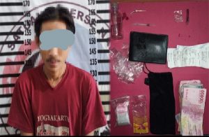 Tulang bawang – jurnalpolisi.id Seorang pemuda berinisial AP (22), berprofesi wiraswasta, warga Jalan V, Kelurahan Ujung Gunung Ilir, Kecamatan Menggala, Kabupaten Tulang Bawang, ditangkap petugas dari Satuan Reserse Narkoba (Satresnarkoba) Polres setempat. Pemuda tersebut ditangkap hari Sabtu (16/10/2021), pukul 21.00 WIB, di sebuah warung di pinggir Jalan V, Kelurahan Ujung Gunung Ilir, karena nyambi sebagai bandar narkotika. “Sabtu malam petugas kami berhasil menangkap seorang pemuda yang nyambi menjadi bandar narkotika jenis sabu saat sedang berada di sebuah warung di pinggir Jalan V, Kelurahan Ujung Gunung Ilir,” ujar Kasatres Narkoba, AKP Anton Saputra, SH, MH, mewakili Kapolres Tulang Bawang, AKBP Hujra Soumena, SIK, MH, Kamis (21/10/2021). Lanjut AKP Anton, dari tangan bandar narkotika ini petugas berhasil menyita barang bukti (BB) berupa satu bungkus plastik klip berisi narkotika jenis sabu dengan berat bruto 0,09 gram, tabung kaca pyrex, dua buah pipet yang ujungnya runcing (sendok sabu), alat hisap sabu (bong), dua buah plastik yang berisi beberapa bungkus plastik klip kosong, kantong kain warna hitam, beberapa lembar kertas bukti transfer, dompet berwarna hitam, dan uang tunai sebanyak Rp 780 ribu. Kasat menjelaskan, keberhasilan petugasnya dalam menangkap seorang pemuda yang nyambi jadi bandar narkotika jenis sabu ini merupakan hasil penyelidikan di wilayah Kecamatan Menggala. Informasi yang didapat bahwa di sebuah warung yang berada di pinggir Jalan V, Kelurahan Ujung Gunung Ilir, sering dijadikan tempat transaksi narkotika. “Saat petugas kami tiba di tempat tersebut, ada seorang pemuda dengan gerak gerik yang mencurigakan. Lalu dilakukan penggeledahan dan ditemukan BB berupa narkotika jenis sabu, bong, pyrex, plastik klip kosong, dan uang tunai,” jelas AKP Anton. Saat ini pemuda yang nyambi jadi bandar narkotika tersebut masih dilakukan pemeriksaan secara intensif di Mapolres Tulang Bawang dan akan dikenakan Pasal 114 ayat 1 Undang-Undang Republik Indonesia Nomor 35 tahun 2009 tentang Narkotika. Dipidana dengan pidana penjara seumur hidup atau pidana penjara paling singkat 5 tahun dan paling lama 20 tahun dan pidana denda paling sedikit Rp 1 miliar dan paling banyak Rp 10 miliar. (Ari jpn)