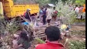 TTS, Kualin – jurnalpolisi.id Sebuah dump truck dengan plat nomor DH. 9838 terlibat dalam kecelakaan lalu lintas tunggal di Taus, Desa Kualin, Kecamatan Kualin, Kabupaten Timor Tengah Selatan (TTS), pada Kamis (4/11/2021) sekitar pukul 12.00 Wita. Pengemudi dump truck yang melaju dengan kecepatan tinggi dikabarkan kehilangan kendali sehingga menyebabkan mobil terbalik dan (empat) orang dinyatakan tewas seketika dalam peristiwa naas tersebut. KSPK II Polsek Kualin, Bripka Yefta Tafui melalui WhatsApp kepada Jurnalpolisi.id menyatakan, kejadian tersebut merupakan kecelakaan tunggal. Bripka Yefta, menyatakan dump truck tersebut berasal dari Desa Nunmafo, Kecamatan Amabi Oefeto Timur, Kabupaten Kupang, yang hendak menuju Ofu, Kecamatan Kolbano, Kabupaten TTS untuk menghadiri acara adat keluarga. Dump Truk dikemudikan Jemri Nomleni dan membawa 12 penumpang, antara lain Norce Liunokas (50), Marce Nenohai (50), Regina Neolaka (50), Sofia Taunu (50), Naema Sae (40), Orince Boimau (40), Yus Talaen (43), Titus Taunu (50), Lambertus Atonis (20), Dominggus Nabut (50), Veki Talaen (18) dan Yuliana Taunu (20), seluruh warga Desa Nunmafo, Kecamatan Amabi Oefeto Timur. Empat orang yang dinyatakan meninggal di tempat kejadian adalah Norce Liunokas, Titus Taunu, Lambertus Atonis dan Dominggus Nabut. Bripka Yefta Tafui menjelaskan bahwa pengemudi (Jemri Nomleni) mengemudikan kendaraan dengan kecepatan tinggi sesaat sebelum kecelakaan. Lebih lanjut, Bripka Yefta juga menyatakan bahwa kondisi saat itu hujan deras, angin kencang dan jalan licin. Kemudian pengemudi tersebut sempat ditegur oleh penumpang untuk memperlambat laju kendaraan, tetapi ia mengabaikannya. Ia menjelaskan setelah melewati Mapolsek Kualin, mobil oleng dan terguling, sehingga penumpang dan barang, serta hewan bawaan yang berada di belakang mobil terbuang keluar dari mobil. “Korban kemudian dibawa ke Puskesmas Kualin dan 2 orang lagi meninggal di puskesmas,” kata Bripka Yefta Tafui. Ia menghimbau para pengendara agar lebih berhati-hati saat berkendaraan. Kurangi kecepatan kendaraan dan utamakan keselamatan. Ia juga mengatakan, kondisi hujan saat ini membuat jalan licin, sehingga perlu waspada dan hati-hati. Mengemudi kendaraan tidak boleh terlalu cepat. “Pengemudi harus berhati-hati karena sekarang musim hujan dan ini murni kecelakaan faktor manusia,” kata Yefta. (Roy Saba)