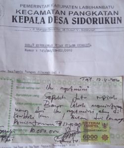 Setelah mendengar Roy mau menjadi saksi, Sudarto menyuruh istrinya Ngatmini mengambil uang Rp. 10.juta dari lemari kamar, dan menyerahkannya , pada Supranoto, selanjutnya dibuat tanda bukti penerimaan uang diatas kwitansi bermaterai yang ditanda tangani Supranoto, sedangkan sebagai saksi saudara Roy. Sebut Sudarto.