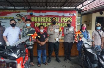 Purbalingga – jurnalpolisi.id Polres Purbalingga kembali menyerahkan empat sepeda motor yang sempat hilang dicuri kepada pemiliknya. Penyerahan secara simbolis dilakukan oleh Kapolres Purbalingga AKBP Era Johny Kurniawan di mapolres, Selasa (16/11/2021) sore. Ada empat sepeda motor yang diserahkan yaitu Honda Vario warna merah bernomor polisi R-6915-BR, Honda Beat Street warna Putih bernomor polisi R-5756-KR, Honda Beat warna Putih bernomor polisi R-6061-C dan Honda Vario warna Putih bernomor polisi R-2572-NV. Kapolres Purbalingga AKBP Era Johny Kurniawan mengatakan hari ini dilakukan kembali penyerahan barang bukti berupa sepeda motor hasil kejahatan pencurian dengan pemberatan (curat). Barang bukti sepeda motor jumlahnya ada empat unit diserahkan kembali kepada pemiliknya. “Ini merupakan hasil kejahatan curat yang terjadi pada tahun 2020 dan tahun 2021. Ada empat laporan polisi yang berhasil diungkap oleh jajaran Satreskrim Polres Purbalingga,” jelas Kapolres didampingi Wakapolres PurbaIingga Kompol Sopanah, Kasat Reskrim AKP Gurbacov dan Kasi Humas Iptu Muslimun. Kapolres menambahkan bahwa penyerahan kembali barang bukti sepeda motor kepada pemiliknya dilakukan secara gratis tanpa dipungut biaya. Namun demikian kami minta kepada pemiliknya, karena berkas masih berjalan apabila dibutuhkan kendaraan bisa dihadirkan kembali. Pemilik sepeda motor bernama Dwi Wahyuni warga Desa Panican, Kecamatan Kemangkon menjelaskan bahwa sepeda motornya hilang pada tahun bulan November 2020. Sepeda motor jenis Honda Beat Street warna Putih bernomor polisi R-5756-KR hilang saat diparkir di teras rumah. Dirinya sempat khawatir sepeda motor tidak bisa ditemukan. Namun setelah kejadian dilaporkan, akhirnya sepeda motor bisa ditemukan oleh polisi dari Polres Purbalingga dan hari ini sepeda motor diserahkan kembali. “Terima kasih kepada polisi Polres Purbalingga sepeda motor saya bisa ditemukan dan pengambilan sepeda motor di Polres Purbalingga tidak dipungut biaya,” ucapnya. Septian Ardi warga Desa Majasari, Kecamatan Bukateja mengaku senang dan merasa bersyukur sepeda motornya yang hilang bisa ditemukan. Sebelumnya sepeda motor miliknya hilang pada bulan Februari 2021 saat terparkir di depan rumah. Kemudian peristiwa tersebut dilaporkan ke polisi hingga bisa ditemukan. “Alhamdulillah saya sangat bersyukur dan berterima kasih kepada jajaran kepolisian Polres Purbalingga yang telah berhasil menemukan kembali sepeda motor saya yang hilang,” ucapnya. (sambudi JPN)