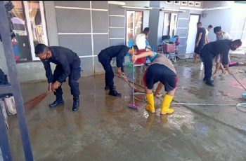 Kolaka Utara – jurnalpolisi.id Personil Kompi 1 Batalyon C Pelopor Satbrimob Polda Sultra bergerak cepat guna membantu warga membersihkan rumah yang dipenuhi lumpur pasca-banjir yang melanda BTN Griya Elegant Tojabi yang bertempat di Desa Tojabi, Kecamatan Lasusua, Kabupaten Kolaka Utara, Provinsi Sulawesi Tenggara, Jumat, 26 November 2021. Bencana Banjir ini diakibatkan curah hujan yang tinggi sehingga mengakibatkan Sungai yang ada lokasi BTN Griya Elegant Tojabi tersebut meluap yang mengakibatkan puluhan rumah warga terendam banjir. Kegiatan kemanusiaan yang dilakukan ini dipimpin langsung oleh Komandan Kompi 1 Bataliyon C Pelopor ( Danki ) IPTU Zainal Abidin, SH guna membersihkan bekas genangan air dan lumpur sisa banjir, Selain itu juga membersihkan sampah – sampah berserakan. IPTU Zainal Abidin, SH mengatakan, Personel Kompi 1 Bataliyon C pelopor Satbrimob Polda Sulra dibagi ke beberapa titik untuk memudahkan pembersihan. Kehadiran Personil Kompi 1 Batalyon C pelopor Satbrimob Polda Sultra di lokasi pasca-banjir tidak lain untuk melaksanakan kegiatan kemanusiaan, selain membersihkan rumah warga personil Brimob Kolaka Utara juga membersihkan selokan yang dipenuhi lumpur dan sampah – sampah yang ditinggalkan oleh banjir, kegiatan ini sebagai bentuk Bhakti Brimob Untuk Masyarakat. “Kegiatan pembersihan kali ini difokuskan mengangkat sisa-sisa lumpur yang masih tertinggal dalam rumah–rumah warga dan selokan yang ada didepan rumah warga.( Pewarta : Arif JPN )