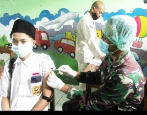 PURBALINGGA – jurnalpolisi.id Dalam rangka mengejar target angka capaian vaksinasi bagi masyarakat di wilayah Kabupaten Purbalingga, Kodim 0702/Purbalingga terus intensifkan serbuan vaksinasi kepada berbagai kelompok masyarakat yang ada. Menurut Lettu Ckm dr Dian Wijayanti selaku Kepala tim vaksinator dari Kodim 0702/Purbalingga, menuturkan jika masyarakat tidak perlu khawatir tidak mendapat vaksinasi karena pihaknya dalam bulan ini masih memiliki stok yang siap untuk didistribusikan, Rabu (17/11/2021). “Kami terus mengejar target capaian vaksinasi di Kabupaten Purbalingga, Stok hari ini (Red: Rabu, 17/11/2021) masih tersedia sebanyak 11.332 dosis jenis Sinovac dan 760 dosis jenis AstraZeneca yang siap didistribusikan,” tuturnya. Disinggung mengenai sasaran vaksinasi, Lettu Ckm dr. Dian menuturkan jika pihaknya melaksanakn sistem jemput bola dalam melayani vaksinasi kepada masyarakat di wilayah Kabupaten Purbalingga. “Kami layani sesuai permintaan kelompok masyarakat dengan sistem jemput bola mendatangi sasaran kelompok masyarakat yang meminta untuk divaksin,” terangnya. Selanjutnya, Sertu Jamaroh sebagai anggota vaksinator Kodim 0702/Purbalingga turut menambahkan jika secara bertahap serbuan vaksinasi Kodim 0702/Purbalingga akan terus digencarkan demi tercapainya target angka capaian vaksinasi di Kabupaten Purbalingga meski berbagai kendala juga turut membatasi. “Kendala yang menonjol terbatasnya vaksinator dari Kodim 0702/Purbalingga sehingga masyarakat diharapkan maklum adanya bila pelayanan belum sesuai harapan masyarakat,” ungkapnya. ( Arif JPN)